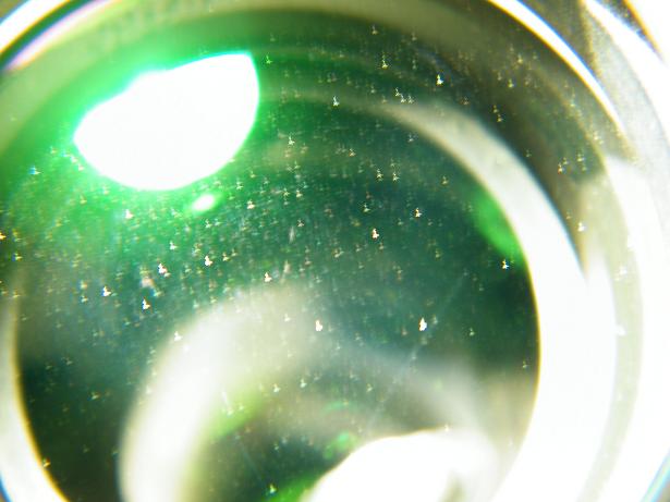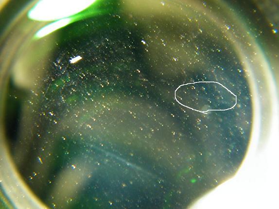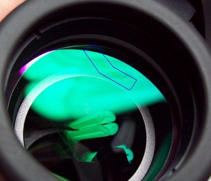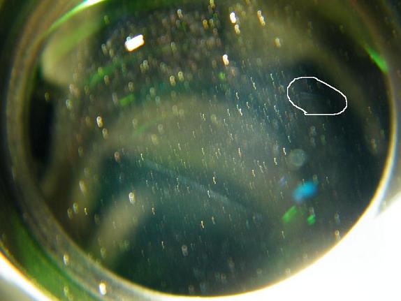 另外请教站长一个问题。我发现当看物镜,当转动镜子,看到那层绿色膜时,在镜片里边左物镜有一长两短细细划痕比头发略粗,右边物镜有一条并不规则。绝不是物镜表面的,因如果在表面印上一个指纹都可明显看出。并不影响使用。请教这是咋回事?