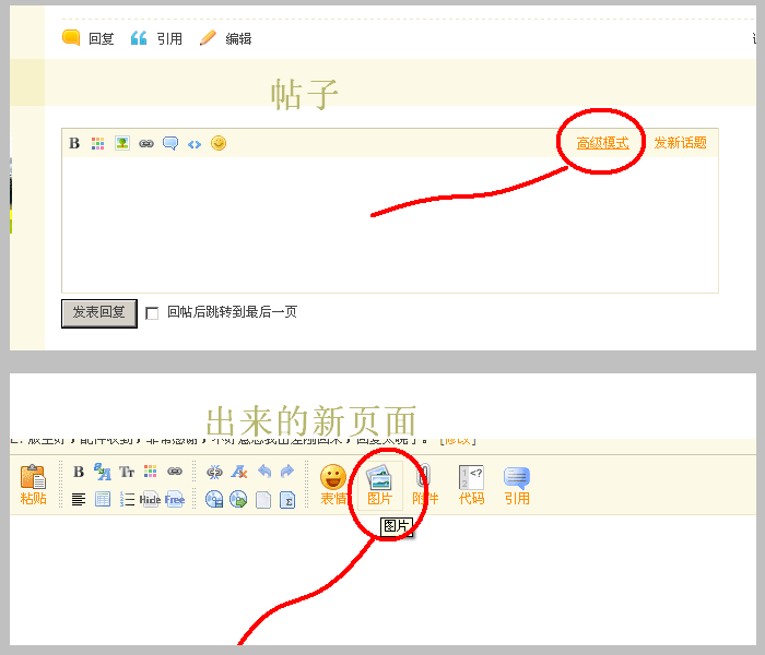 想上传图片的话,只要您在回复帖子的时候,用“高级模式”就行了:)