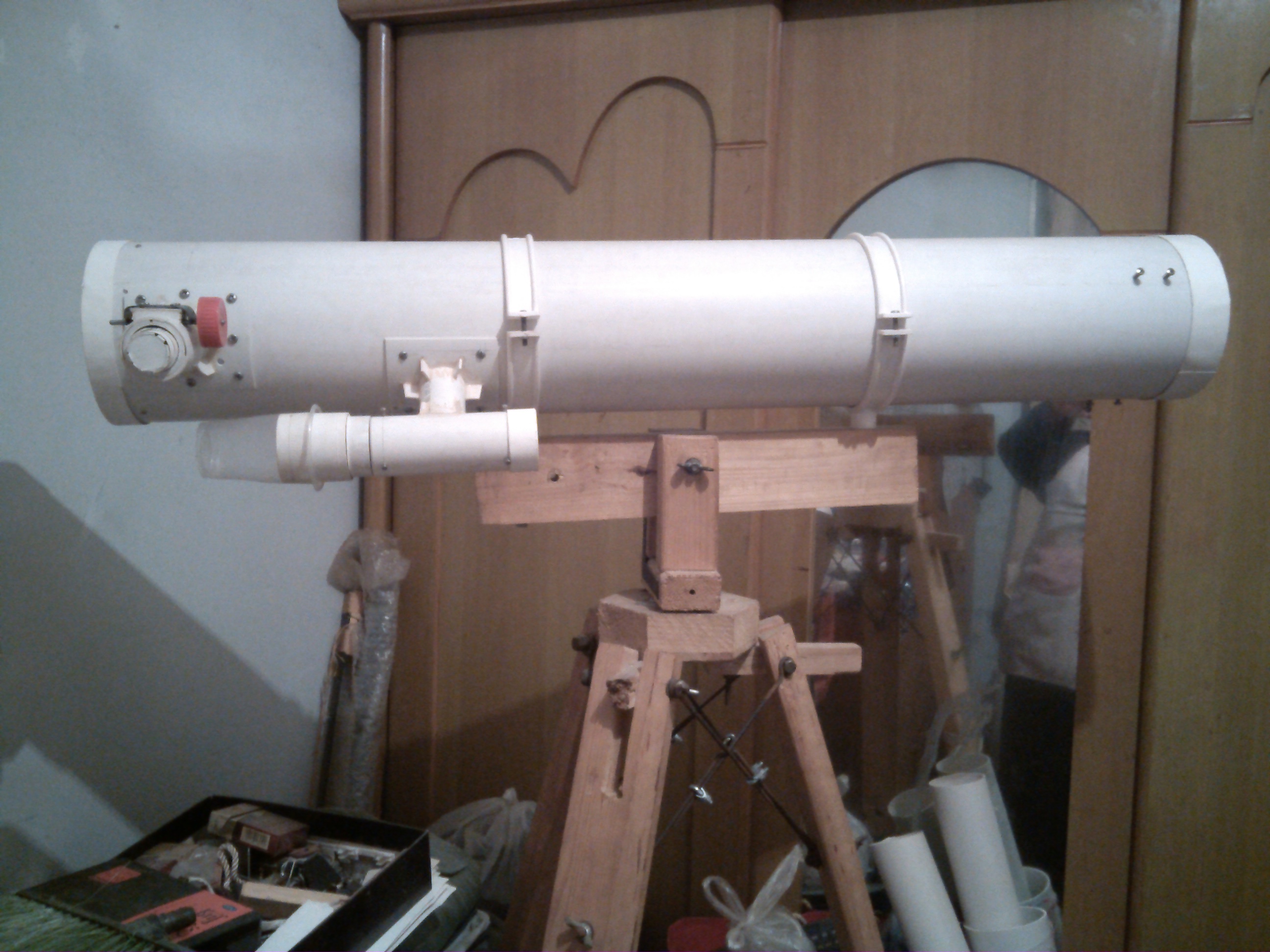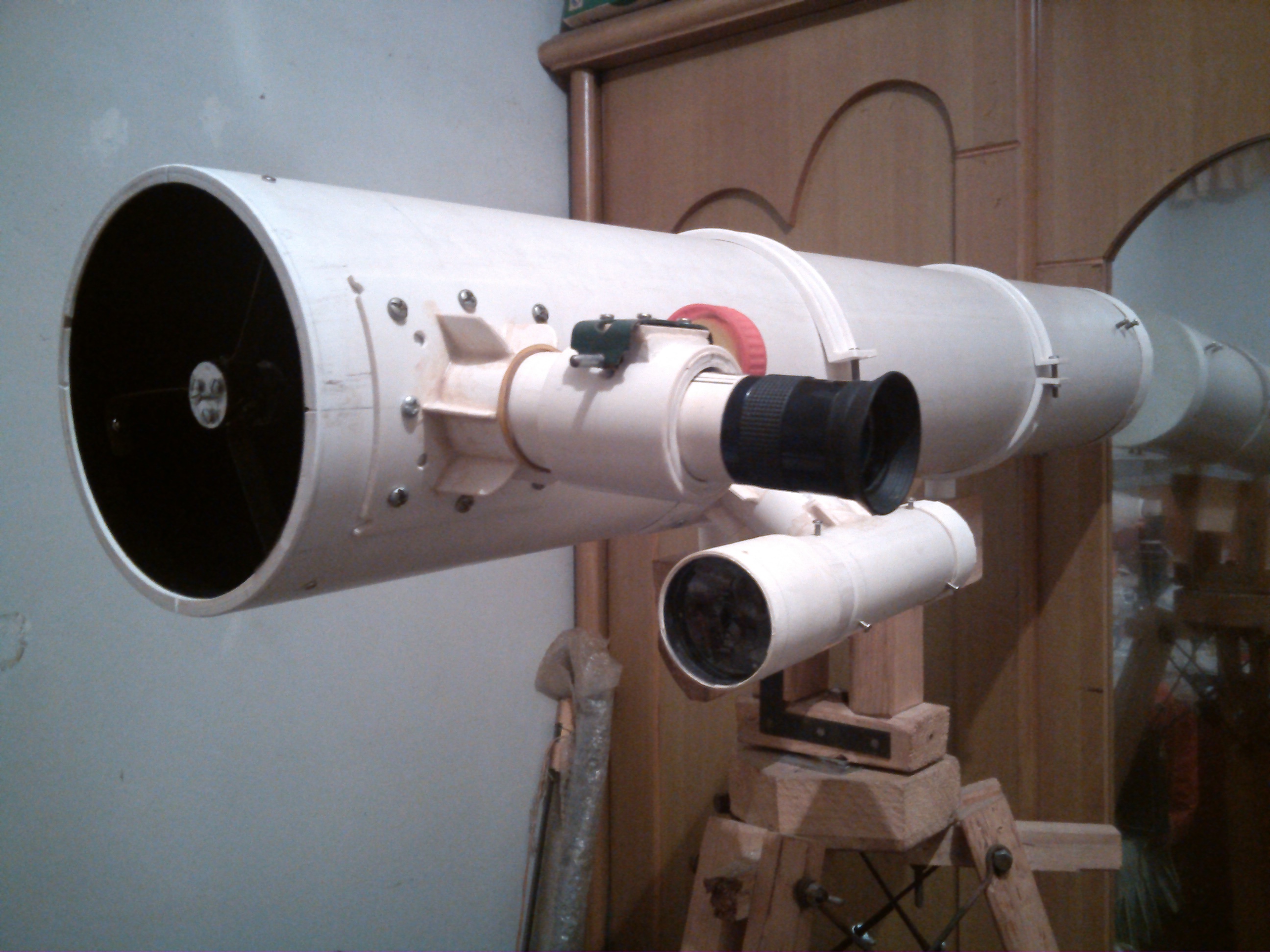 物镜是买的,网上也有人手工磨制,不过太麻烦,一整套工具不说,还太耗时间了,而且自己没法镀膜,不是十分发烧的话,还是买现成的比较好。其他的就是pvc管,锯,切,粘,钻,固定等等,慢工出细活,反正DIY就是图个乐子。