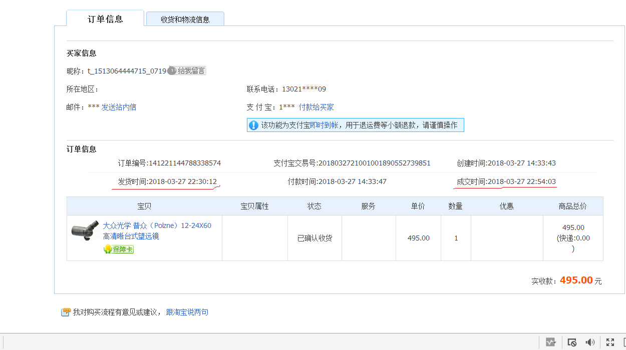 1、正常人都是收到货后才慢慢付款。咱们在淘宝上操作发货后24分钟,货还没到,对方就马上确认了收货了。而实际货物是好几天后才收到的(见截图)。这个异常是事后看交易记录,才发现的。【之前不理解原因,后来想到,这一步应该说明它受第三方雇佣,它这种不正常的提前确认收货,本质是因为从雇佣者手里拿到部分货款,没仔细想,但大概应该是这样】
